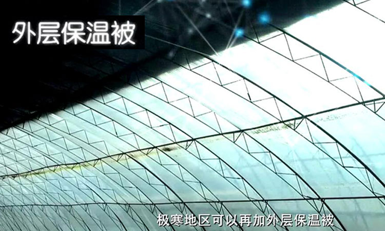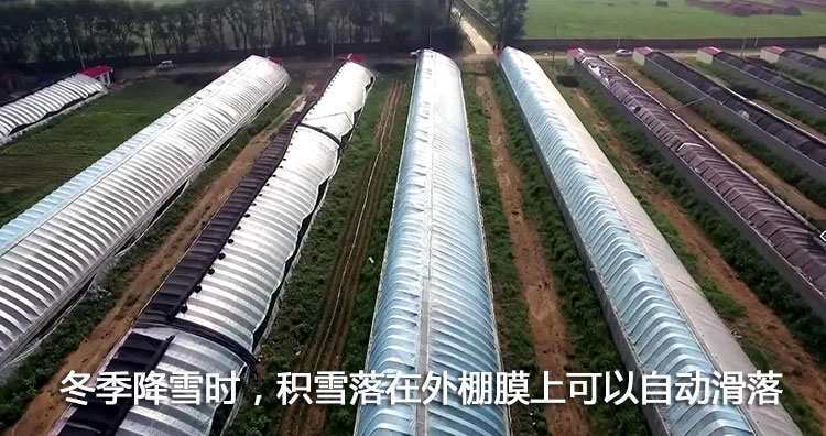 內保溫日光溫室采用新型防水保溫覆蓋材料,導熱系數僅為0.038W/(㎡·K),內置的保溫被不受雨雪風(fēng)和太陽(yáng)直射的影響,使用壽命延長(cháng)。冬季降雪時(shí),積雪落在外棚膜上可以自動(dòng)滑落。避免雪災危害,極寒地區可以再加外層保溫被,形成雙層保溫被,作物可以安全越冬。
