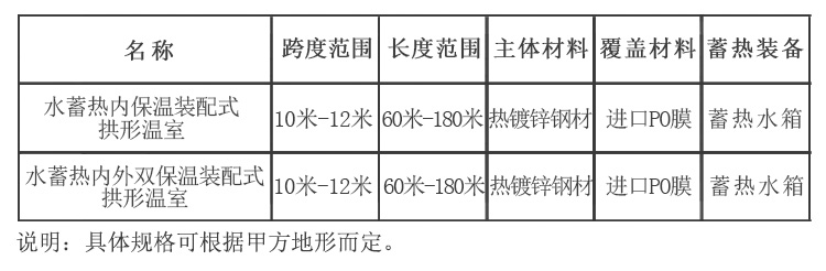 水蓄熱內(雙)保溫裝配式拱形溫室配套設備包括:溫室主體、拱形骨架系統、外膜系統、內膜系統、放風(fēng)系統、內保溫系統、外保溫系統、新型水蓄熱系統、安裝系統、供電系統。