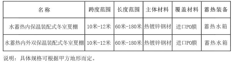 水蓄熱內(雙)保溫裝配式冬室夏棚配套設備包括:溫室主體、骨架系統、外膜系統、內膜系統、(前坡上、前坡下、后墻下)放風(fēng)系統、內保溫系統、外保溫系統、后墻保溫系統、新型水蓄熱系統、安裝系統、供電系統。
